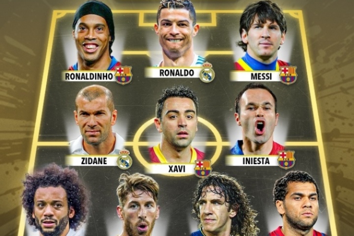 中场:齐达内(皇马)、哈维(巴萨)、伊涅斯塔(巴萨)