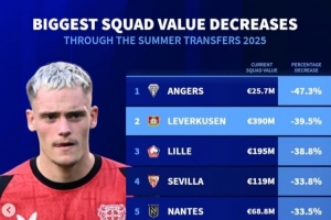 体育资讯9月7日讯 《转会市场》统计了今夏转会窗过后的总身价下降比例情况,昂热居首,法甲7队在列。