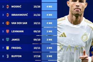 体育资讯09月12日讯 转会市场网盘点了足坛历史上40岁以上球员的身价排名,其中本赛季的C罗以1200万欧元高居榜首。