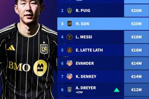 体育资讯09月13日讯 德转更新美职联身价排行榜,德保罗、普吉、孙兴慜三人并列最高,梅西排在第4,详细如下。