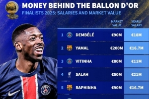 体育资讯9月23日讯 德国转会市场盘点了2025年金球奖排名前10球员的年薪,姆巴佩3130万欧居首,金球奖得主登贝莱1800万欧。
