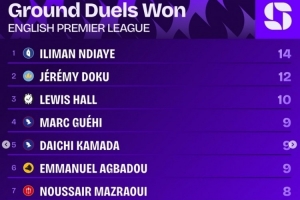 英超第5轮赢得地面对抗次数榜: